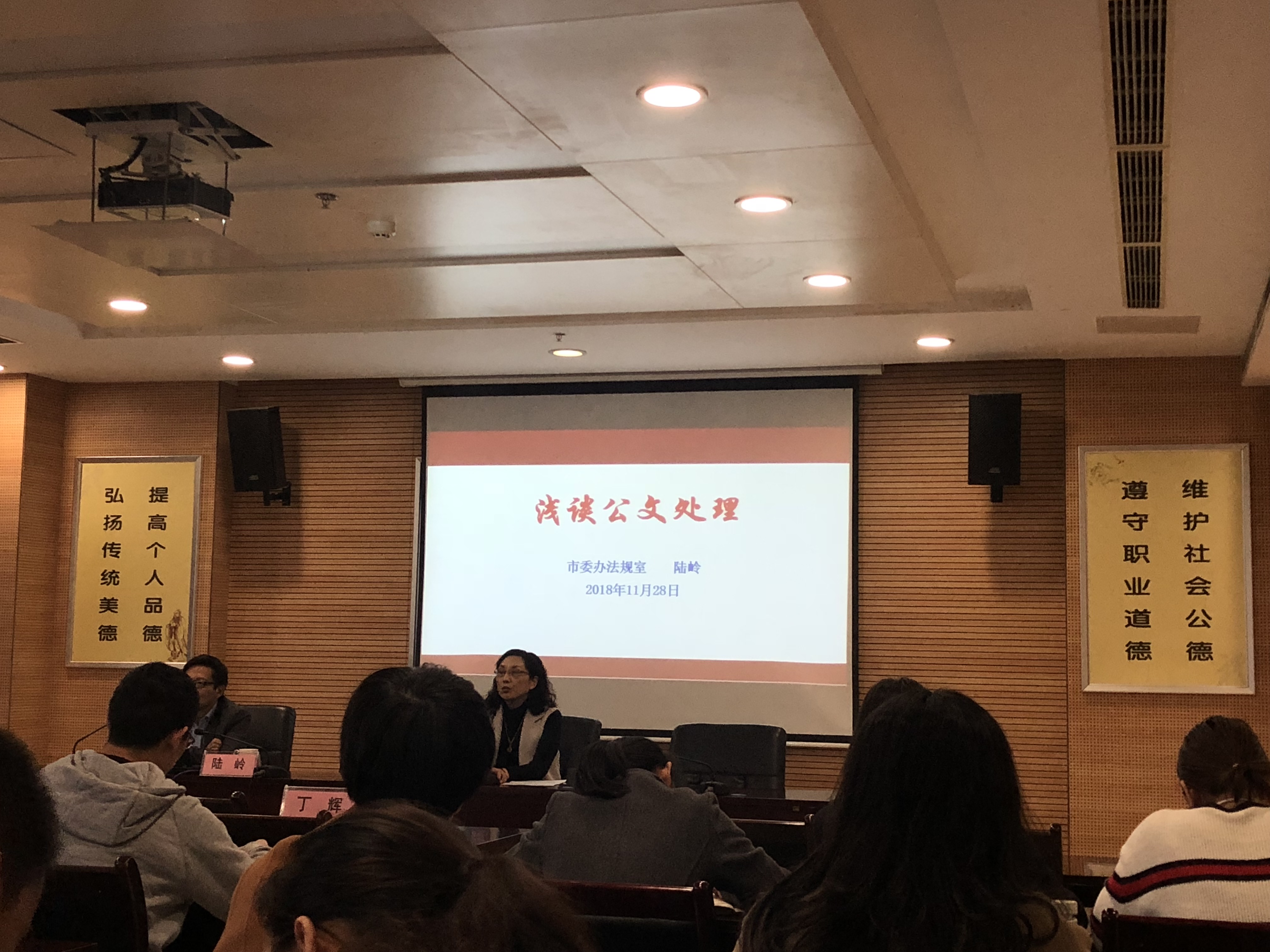 會(huì )議由市委辦法規室陸主任主講。陸主任從公文概述、公文格式、行文規則等六個(gè)方面講解了公文的處理。陸主任由公文的概述引出了公文處理的三大環(huán)節:公文擬制、公文辦理、公文管理,而此次培訓主要圍繞著(zhù)公文擬制環(huán)節而展開(kāi)。說(shuō)道公文格式時(shí),陸主任主要以錯誤案例作為講解,大大加深的大家的印象,陸主任指出在工作中,公文代表一個(gè)公司的形象,公文的錯誤不容忽視,大家應嚴格按照公文規定,嚴格核對,避免錯誤。最后陸主任與大家分享了他的工作體會(huì ),傳授給大家他的經(jīng)驗教訓。