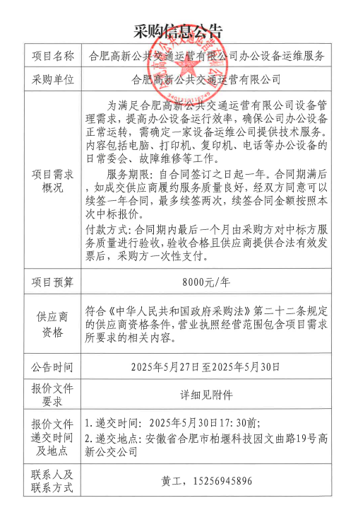 合肥高新公共交通運營(yíng)有限公司辦公設備運維服務(wù)采購信息公告