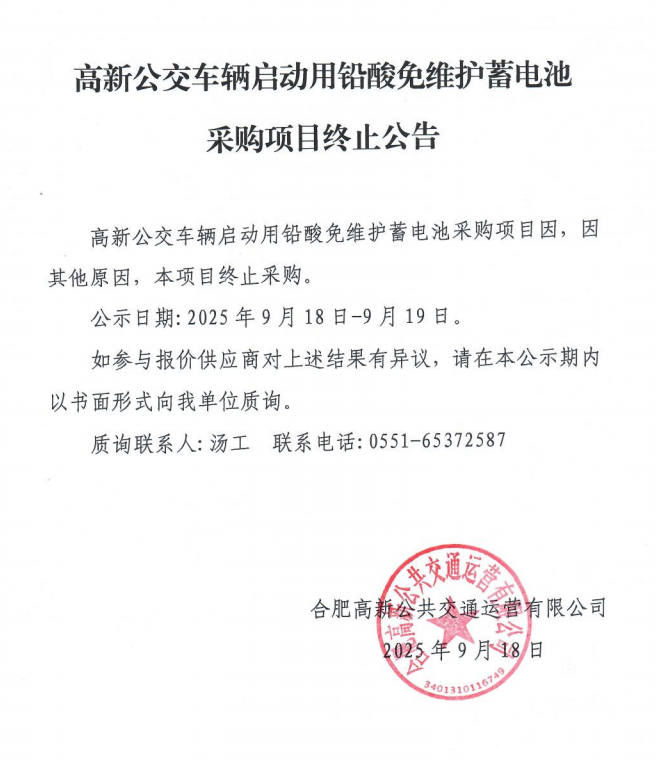 高新公交車(chē)輛啟動(dòng)用鉛酸免維護蓄電池采購項目終止公告